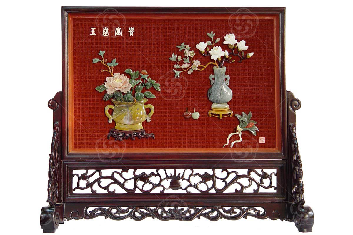 雕漆嵌玉工藝須先在所制器物上髹涂數十層到幾百層中國大漆,然后雕刻各種圖案和錦紋,紋樣優美、刀法圓潤。雕漆嵌玉是揚州的高檔漆器工藝,采用珊瑚、翡翠、瑪瑙、稀有黑玉等高檔材料結合揚州漆器工藝構成了一幅色彩豐富、雕刻精致、圖案優美、立體感強、自然生動的藝術作品。